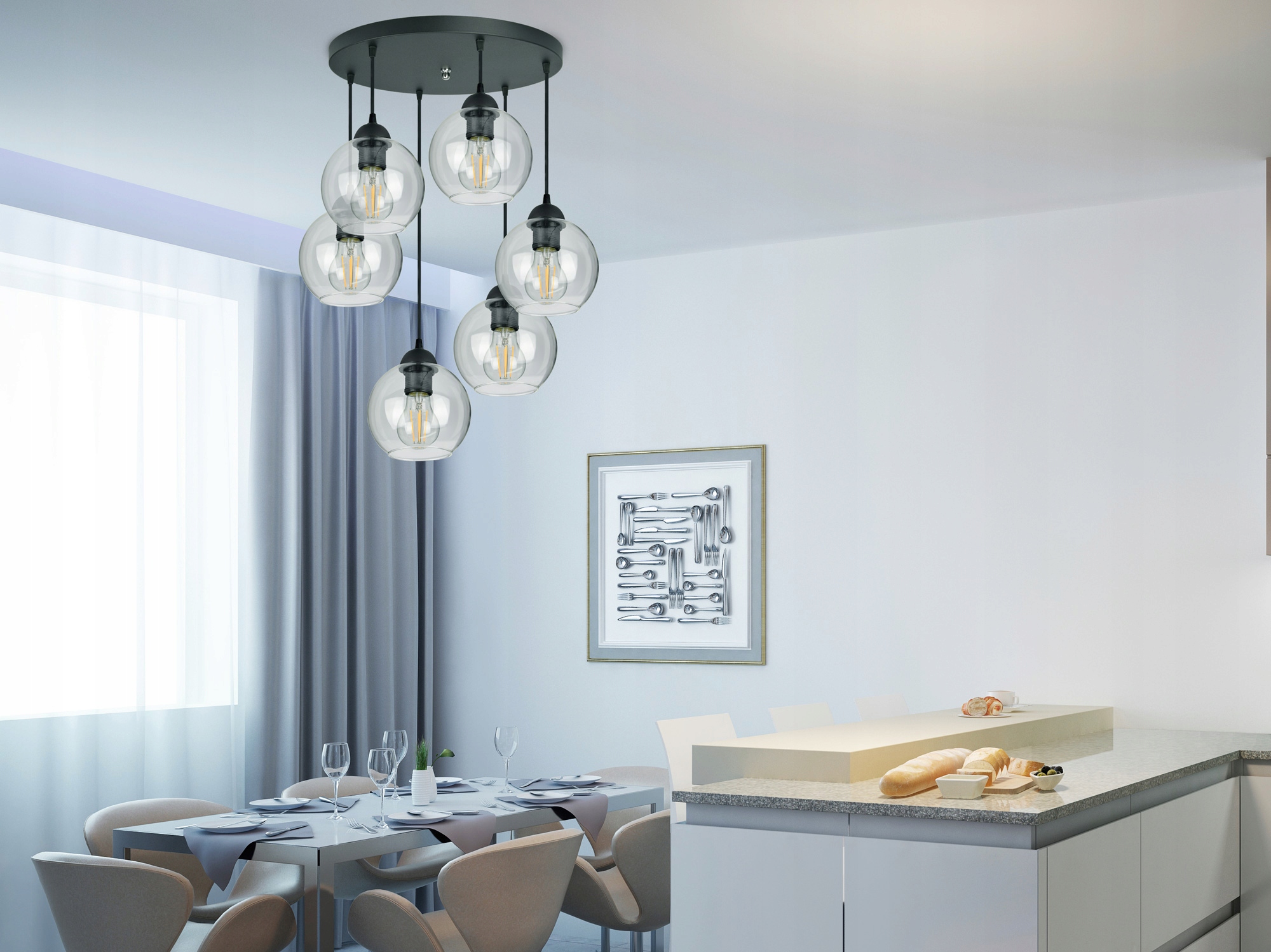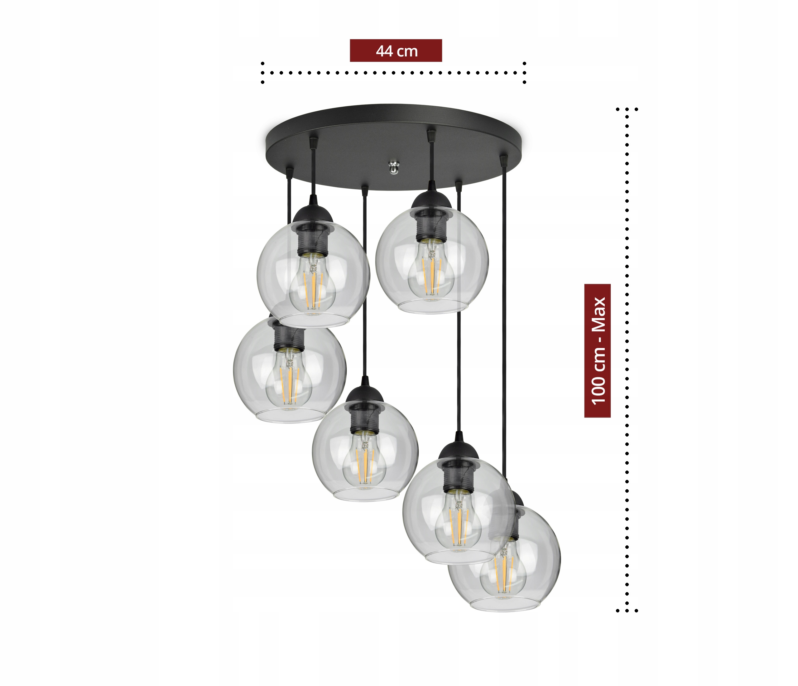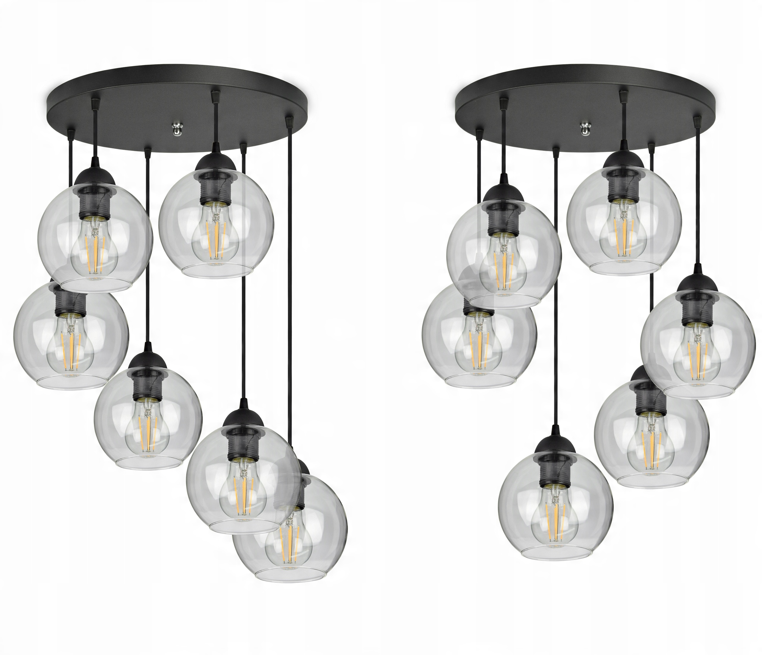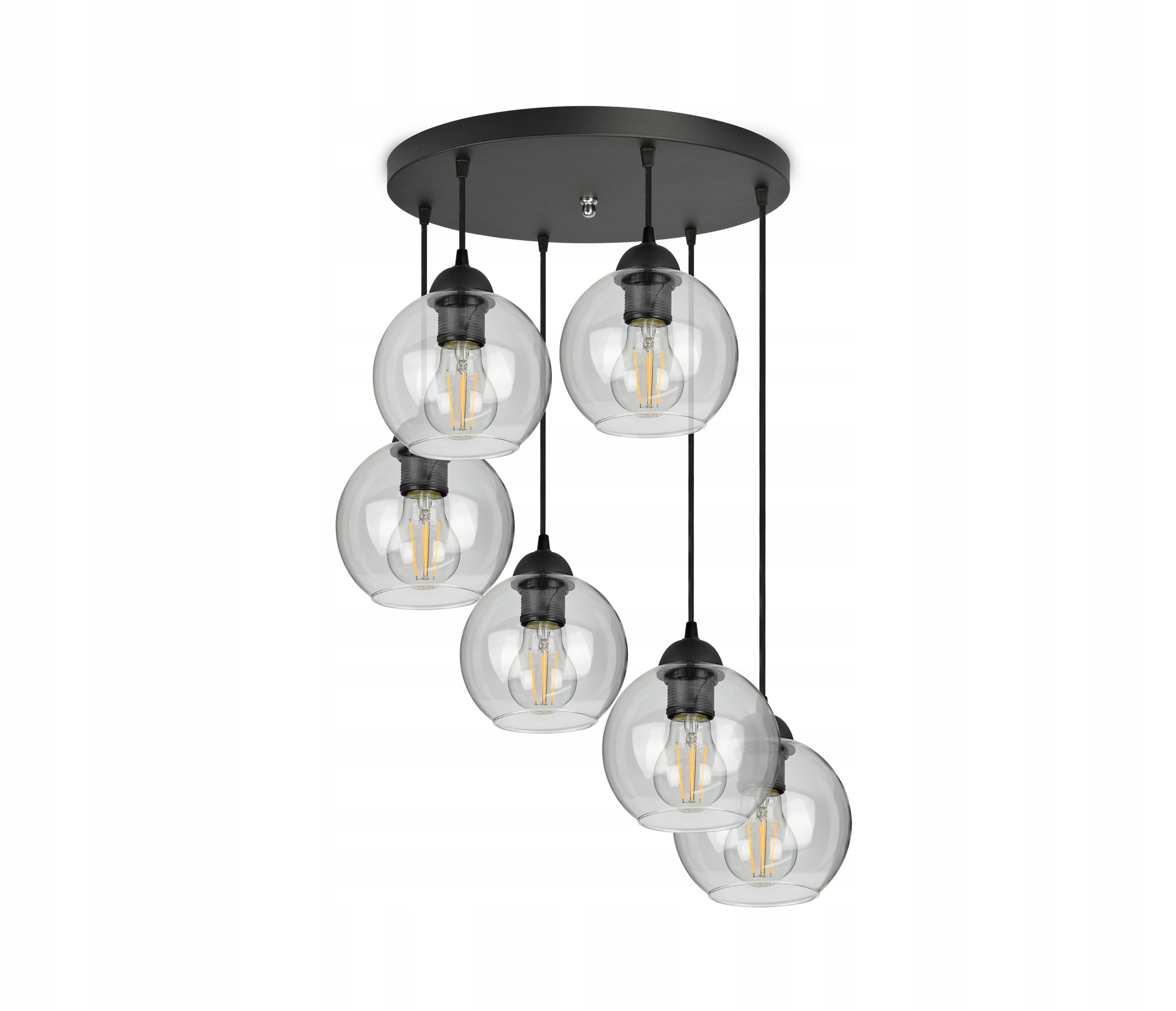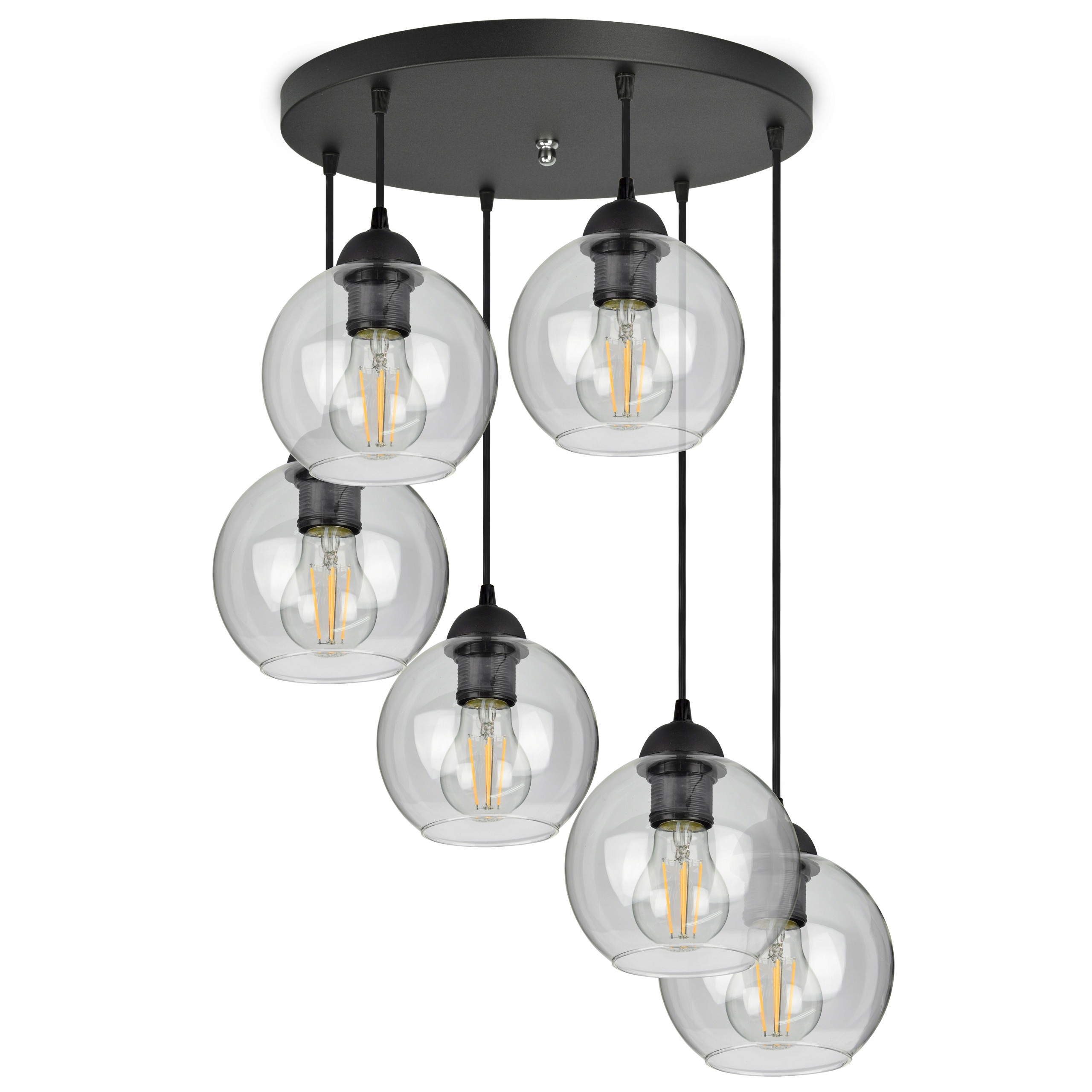 Nowoczesna, duża lampa wisząca wyposażona w sześć szklanych, transparentnych kloszy w kształcie kuli.