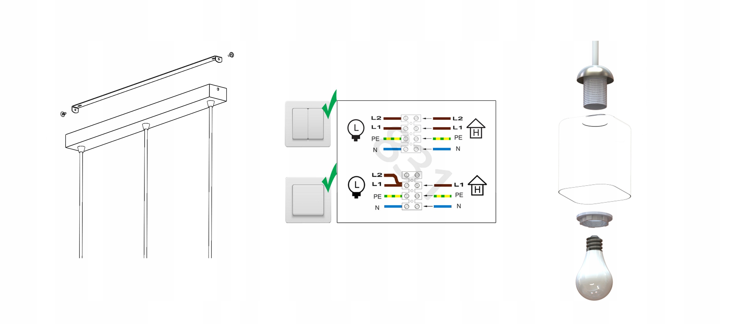 Zestaw nie zawiera żarówek oraz kołków rozporowych (należy dobrać odpowiednie do sufitu)